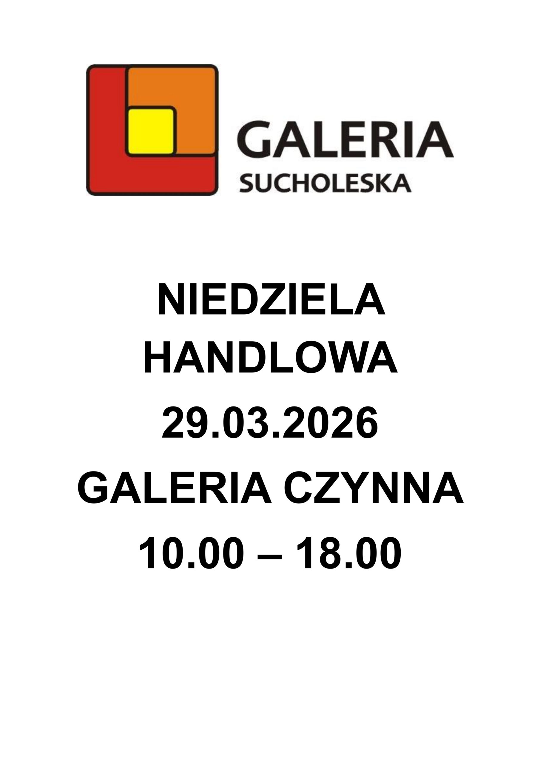 Informujemy, że w niedzielę 29 marca 2026 r. Galeria Sucholeska będzie otwarta w godzinach 10:00–18:00. Serdecznie zapraszamy!